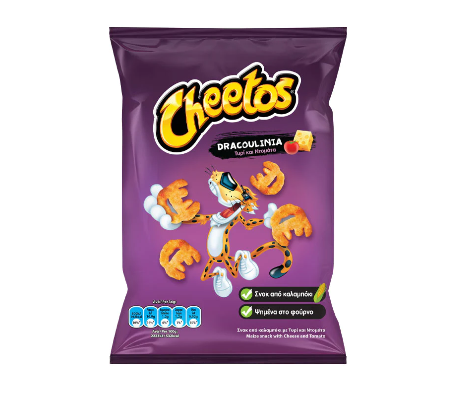 Dracoulinia by Cheetos are a maize snack made with corn, cheese and tomato. They are called Dracoulinia as they have the shape of Dracula's fangs. They are considered one of the top snacks in Greece, and are made for every moment of the day!