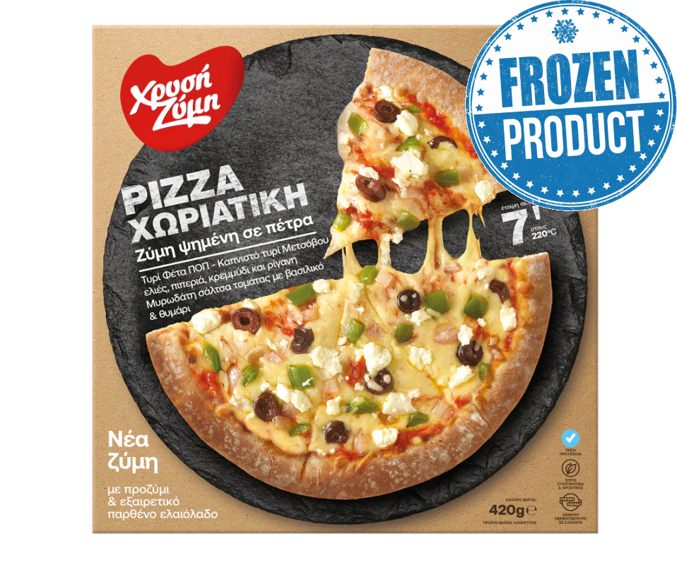 Hrisi Zimi Pizza Horiatiki! Fluffy dough with yeast prebaked on stone with the rich flavor of smoked Metsovou cheese and the flavors of traditional olive, onion and pepper promise a mouthwatering Horiatiki Experience. No artificial food colors and kneaded with extra virgin olive oil!